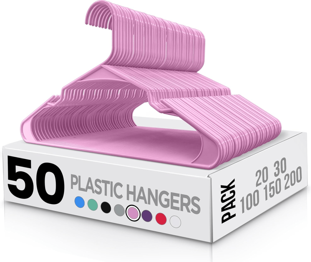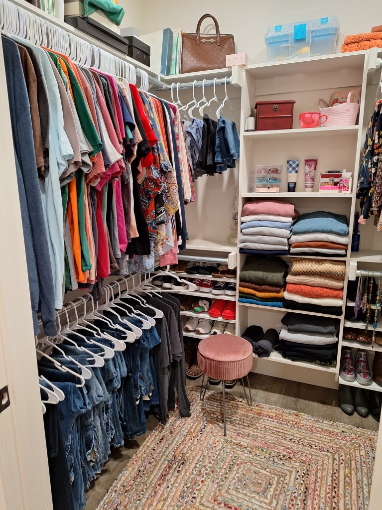 This is my closet, I do love it ❤️ and I organized it cheaply. A lot of the things are just visual, using all the same color hangers for example. I chose all white and you can get those cheaply at Wal-Mart. I did recently order some from Amazon because the Wal-Mart hangers seem to get more frail every time I buy them or maybe I am just hard on hangers 💪. So I got these white however I really really really want to change them to the pink 💖……I am not going to cause that would just be frivolous 💰 but I want to! 😁